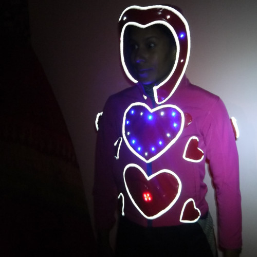 Finished love heart jacket. Hearts attached with stitching and Velcro on front and back. New heart shape hood looking great in day and night!