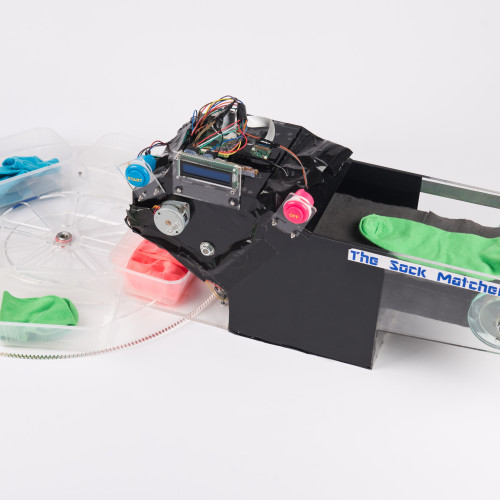 The Sock Matcher 5000 is being driven by a Raspberry Pi. The Pi Camera will detect when it sees a sock, then identify the sock colour and rotate the sorting plate to the assigned sock box. The Pi will then drive motors to move the sock conveyor belt so the sock drops through the funnel.